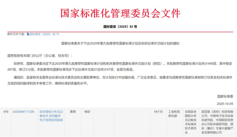 Recently, the national standard project titled “Blockchain and Distributed Ledger Technology – Application Services – Guidelines for Electronic Signature Applications” (Project No. 20255467-T-339), administered by the National Technical Committee on Blockchain and Distributed Ledger Technology Standardization (TC590), has been officially approved for establishment.This standard defines the framework, principles, participants, and key processes for electronic signature applications based on blockchain technology. The formulation of this standard will help ensure the authenticity, integrity, and non-repudiation of electronic signature data, achieving traceability and accountability for all signature activities.In the official announcement released by the State Administration for Market Regulation and the Standardization Administration of China, the list of main drafting organizations has drawn significant attention. Among them, Shenzhen Esignaturechain Technology Co., Ltd. stands alongside authoritative national institutions such as the China Electronics Standardization Institute and the China International Information Security and Blockchain Research Institute.Leveraging the immutability and traceability features of blockchain technology, Shenzhen Esignaturechain Technology Co., Ltd. provides standardized solutions to address key pain points in traditional electronic signature applications—such as centralized data storage and the complexity of judicial evidence authentication. The establishment of this standard will effectively ensure the authenticity, integrity, and non-repudiation of electronic signature data, ultimately achieving full-process traceability and accountability of electronic signature activities. This contributes to building a higher level of trust infrastructure for the digital economy and society.The approval of this national standard marks not only an honor but also a great responsibility for Esignaturechain. Moving forward, the company will continue to uphold its spirit of technological innovation, strictly adhere to national standards, and continuously optimize its products and services. By working closely with ecosystem partners, Esignaturechain aims to promote the deep application of blockchain-based electronic signatures across key sectors such as government services, fintech, supply chain management, and judicial evidence preservation—further contributing to China’s digital transformation.Trust is the passport to the digital world. Esignaturechain is committed to making that passport safer, more reliable, and truly ubiquitous.